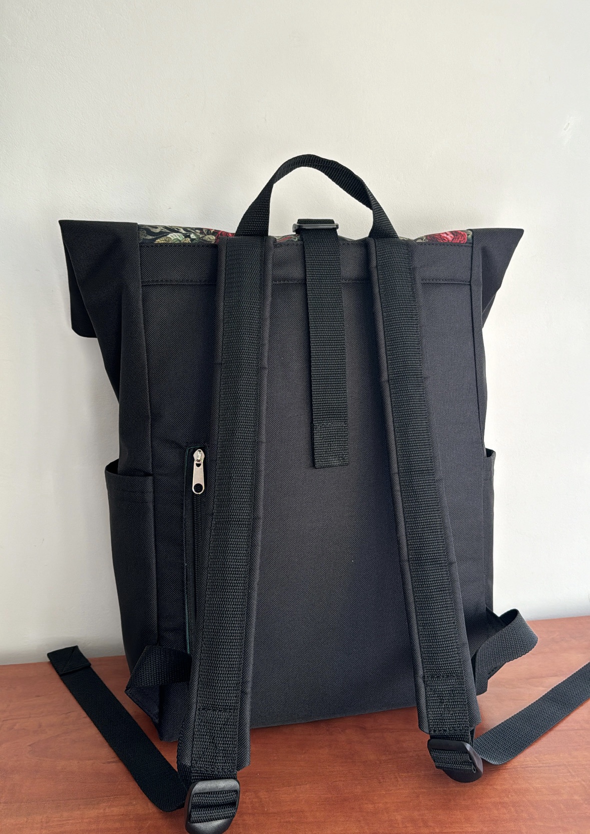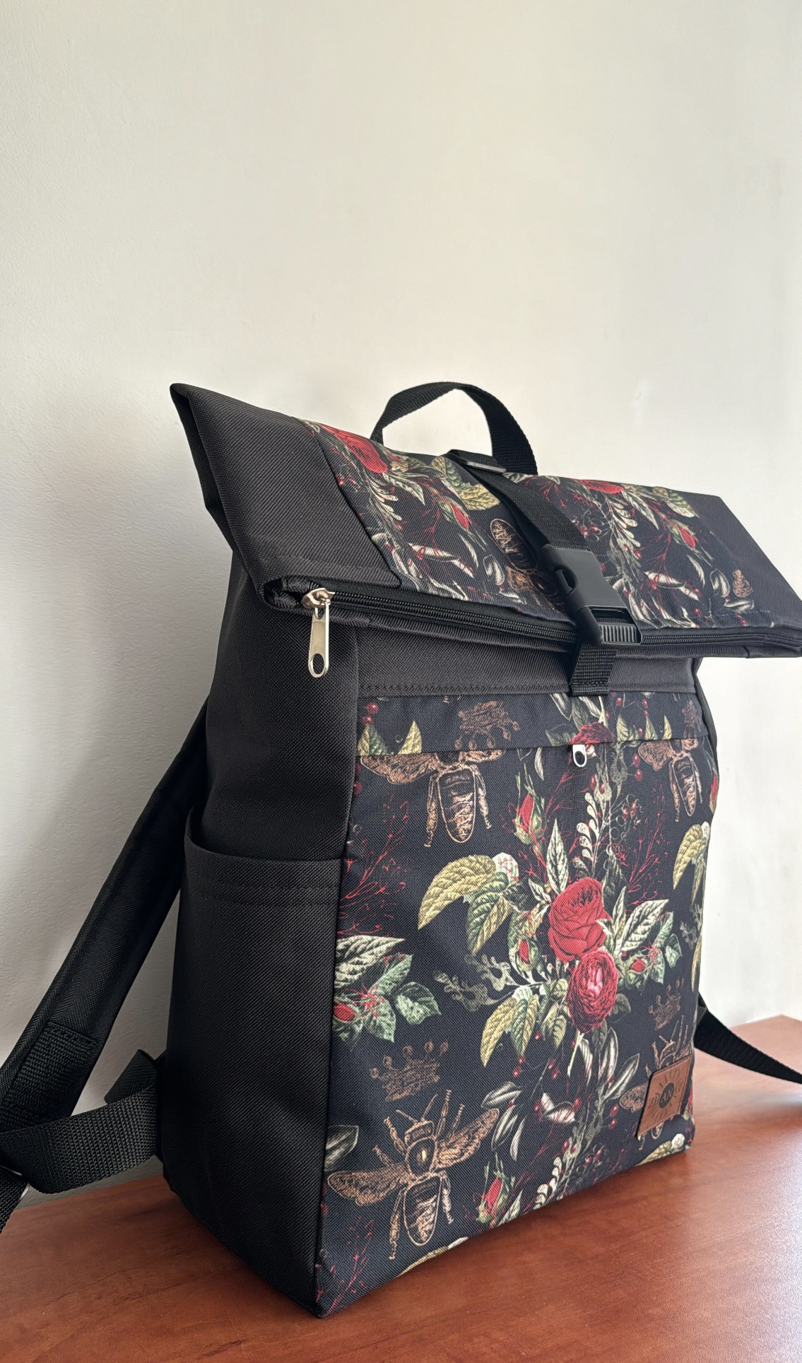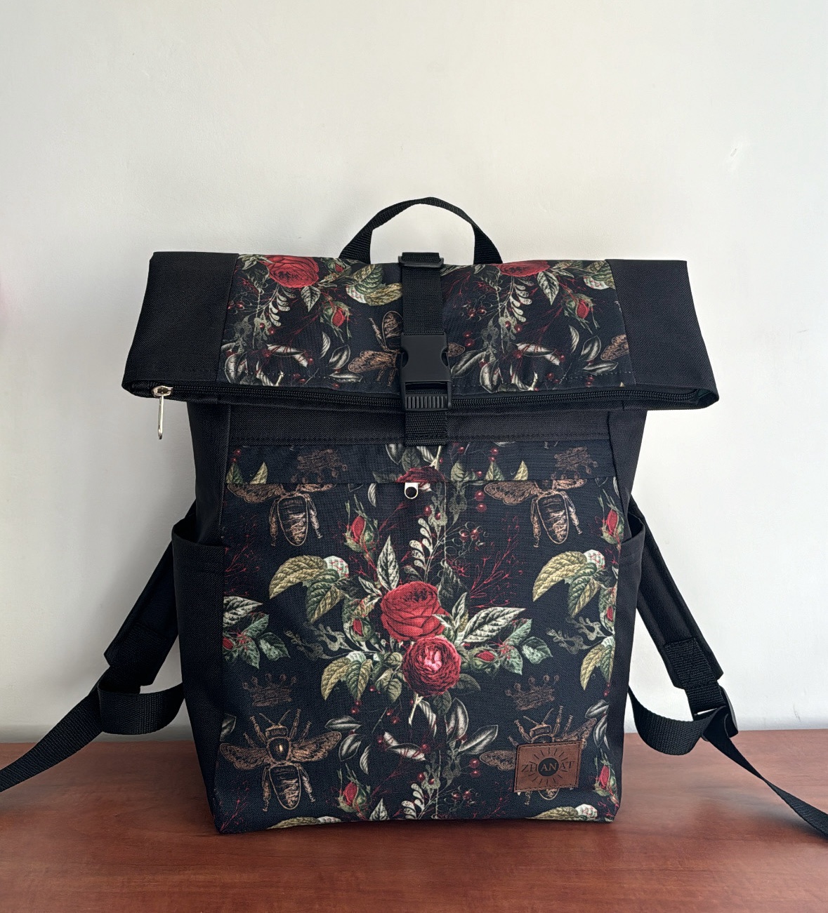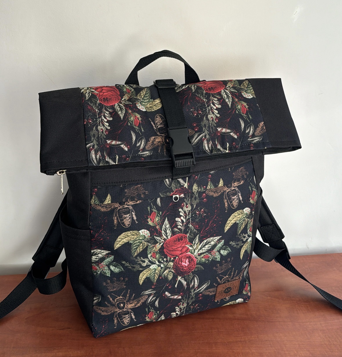 Plecak w róże i pszczoły. Wykonany z materiału wodoodpornego. Główna komórka zapinana jest na zamek. Podszewka bawełniana w kolorze butelkowej zieleni. Plecak zapewnia stabilność i komfort noszenia dzięki usztywnionym plecom, wzmocnionemu dnu oraz przeznaczonej kieszeni na laptopa. Dodatkowo zamknięcie na plastykową klamrę pozwala na regulację wysokości plecaka, dostosowując go do indywidualnych potrzeb.