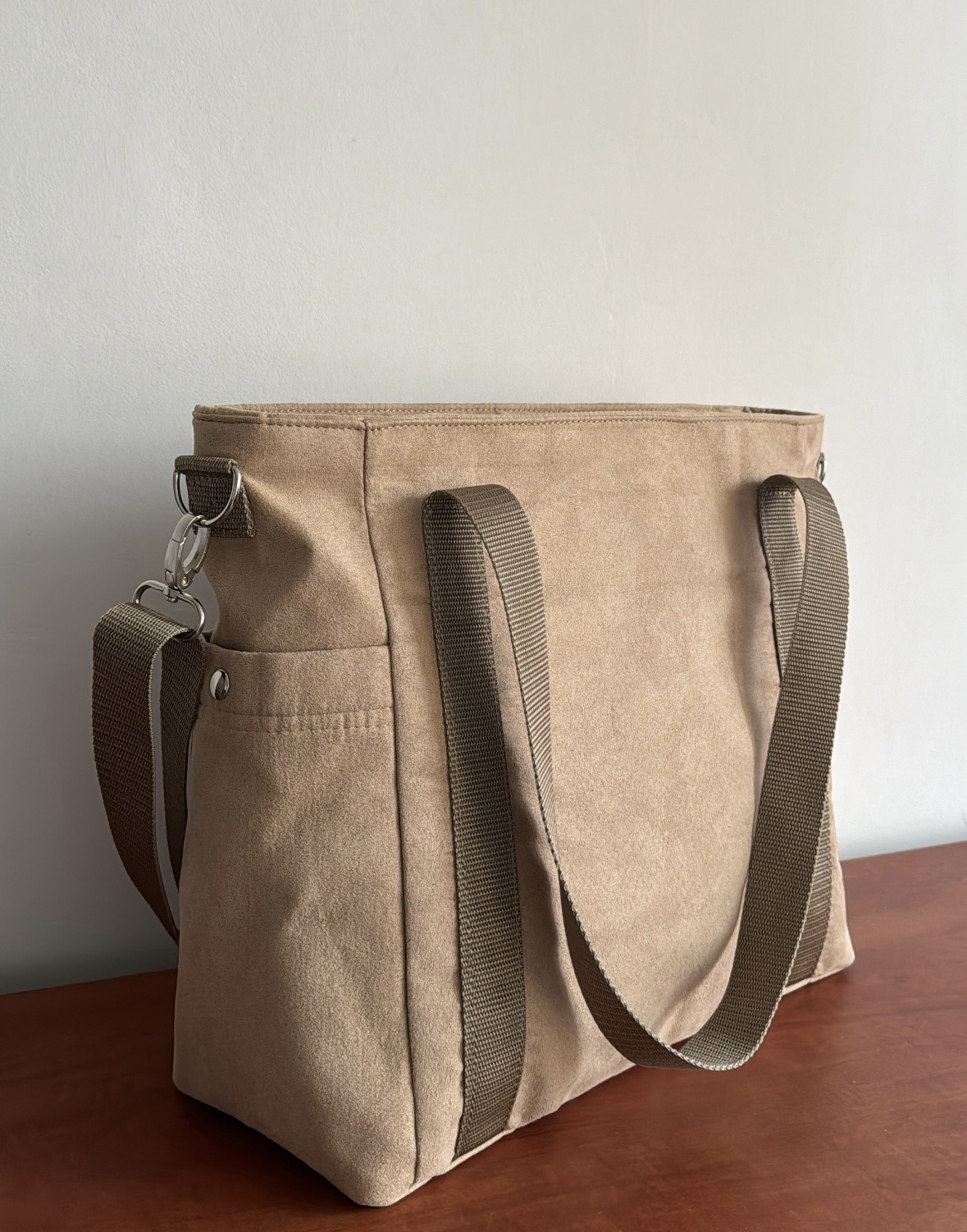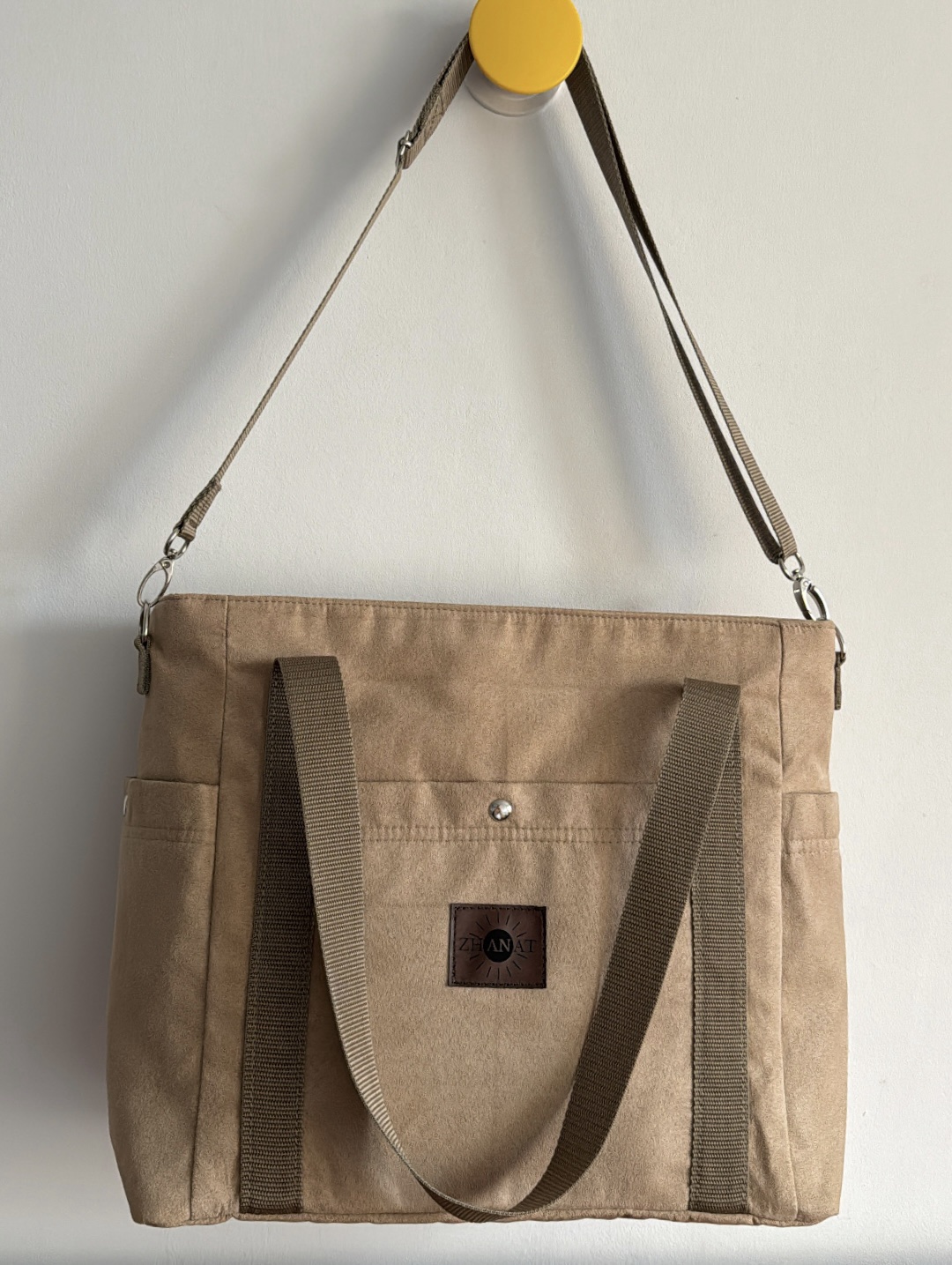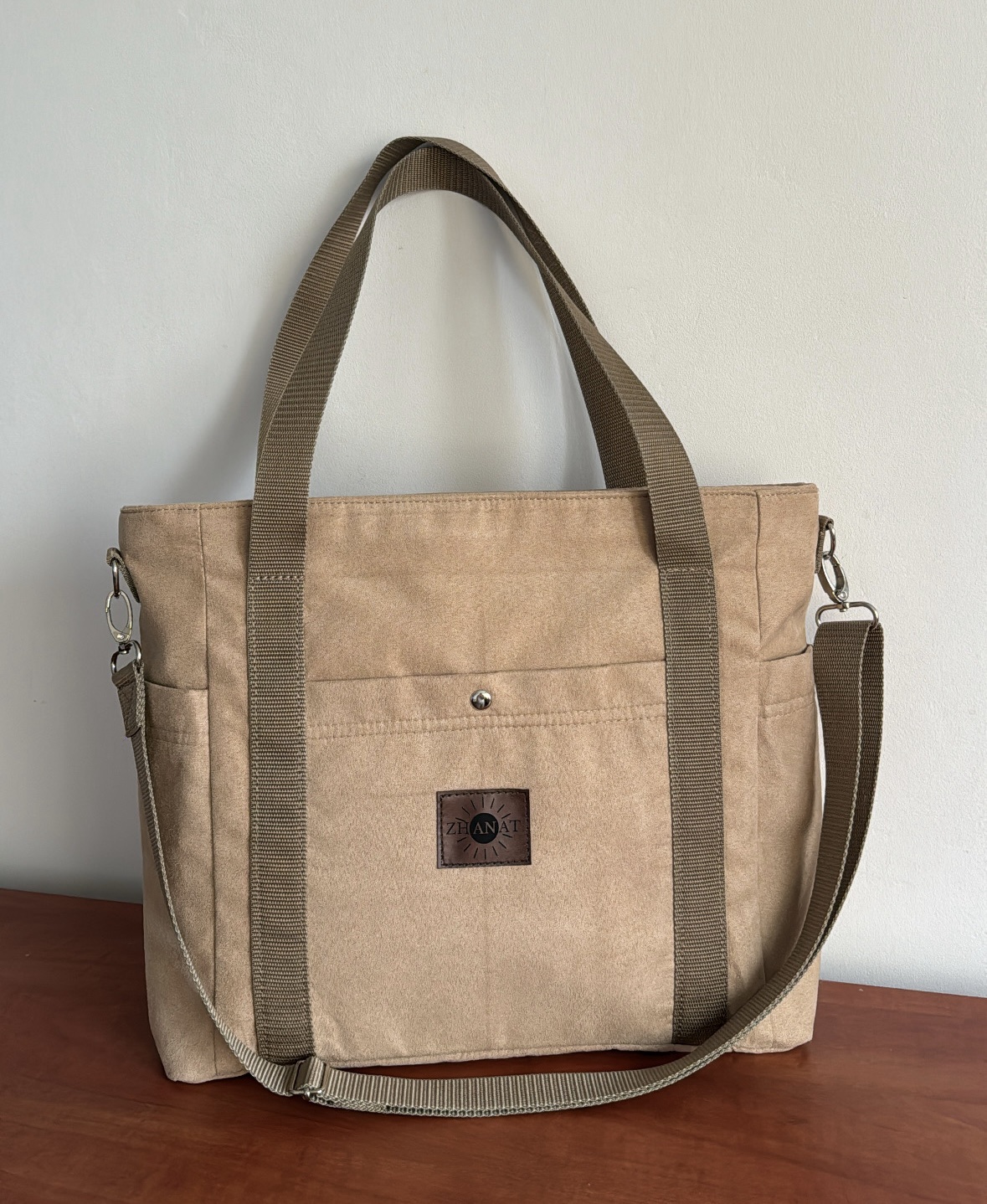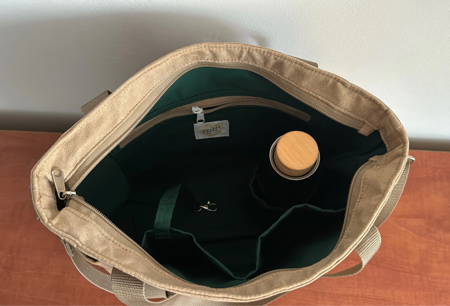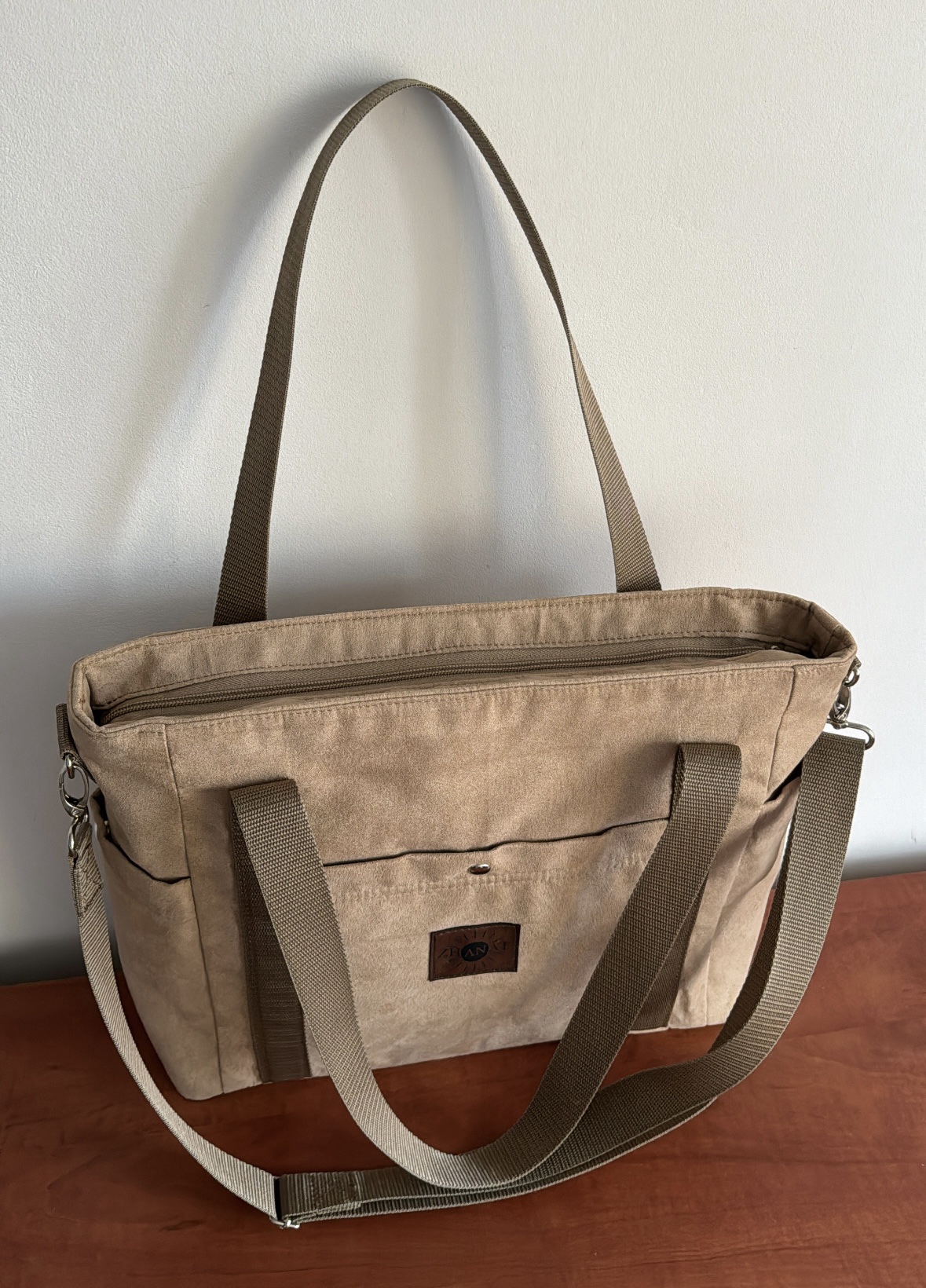 Torba Shopperka Magnetic to praktyczna torba idealna na co dzień. Zapewnia wygodę noszenia i piękny wygląd. Materiał: nubuk, w kolorze beżowym. Torba mieści format A4. Podszewka bawełniana w kolorze butelkowej zieleni. Uchwyt o długości – 56 cm sprawia, że torba jest wygodna do noszenia na ramieniu. A także posiada długi pasek – 120 cm, zapinany na karabińczyki, do noszenia na różne sposoby.