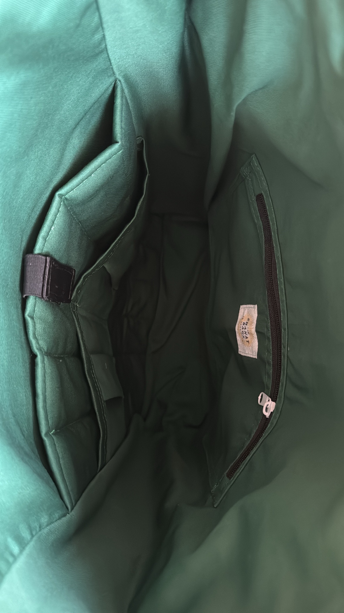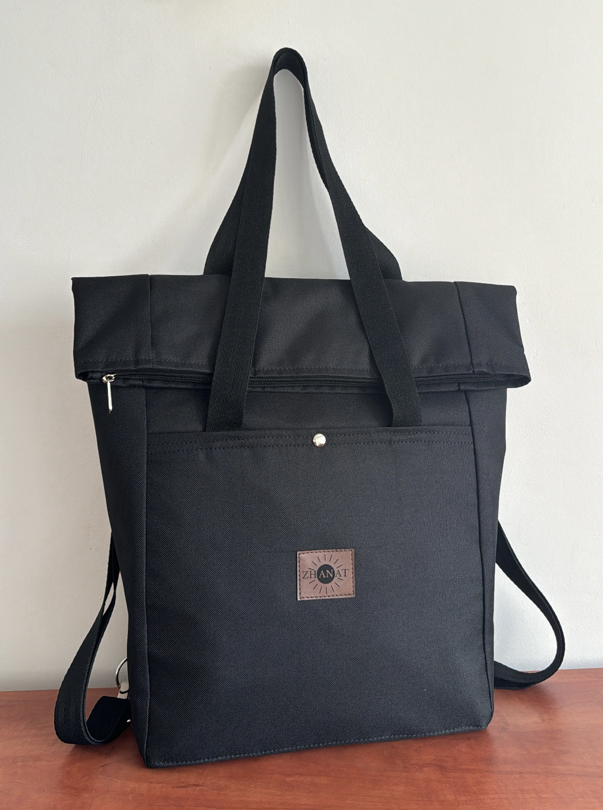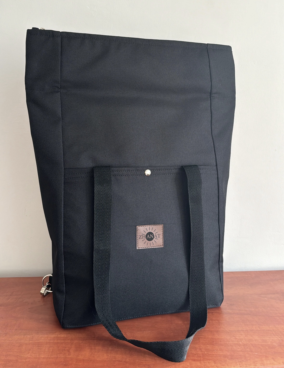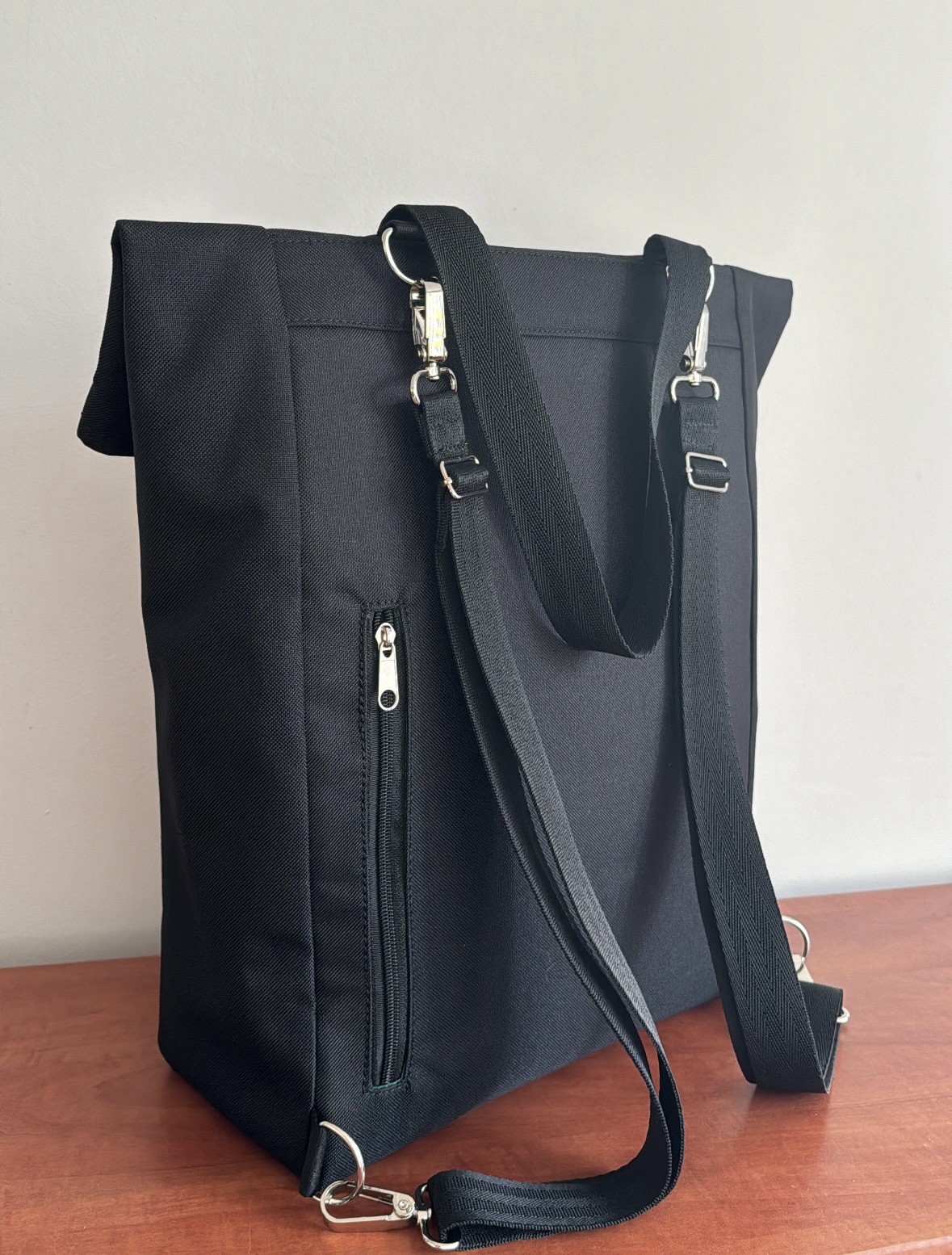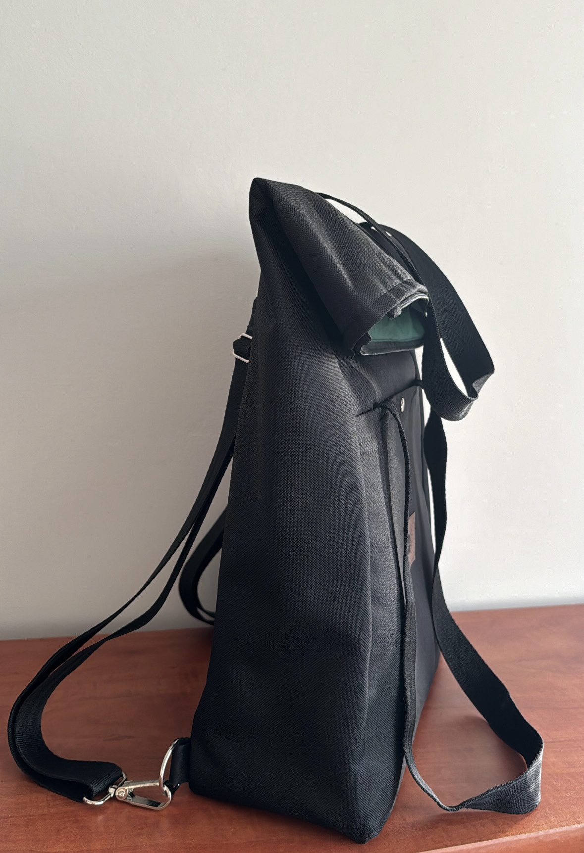 Torbo – plecak w kolorze czarnym z materiału wodoodpornego. Główna komórka zapinana jest na zamek. Podszewka bawełniana w kolorze zielonym. Plecak zapewnia stabilność i komfort noszenia dzięki usztywnionym plecom, wzmocnionemu dnu oraz przeznaczonej kieszeni na laptopa. Szelki wykonane są z taśmy o szerokości 3 cm i zapinane na karabińczyki. W razie potrzeby można je odpiąć i nosić plecak jako torbę na ramię, dzięki krótkiemu uchwytowi o długości 52 cm.